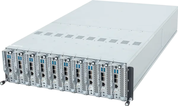 Supermicro各ノード: 最大192GBメモリー、最大4個の 2.5" NVMe/SATA、PCIe 5.0 x16 拡張スロット、3U 10ノード コンパクトブレード